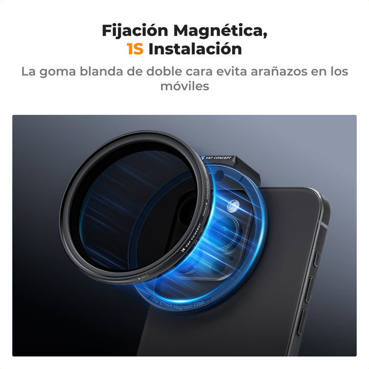 El sistema magnético K&F Concept permite instalar o cambiar filtros instantáneamente, sin roscas ni complicaciones. Compatible con toda la línea de filtros magnéticos de 67mm —ND, CPL, UV, Black Mist, GND, entre otros—, este adaptador convierte tu celular en una herramienta profesional capaz de lograr resultados cinematográficos en segundos.