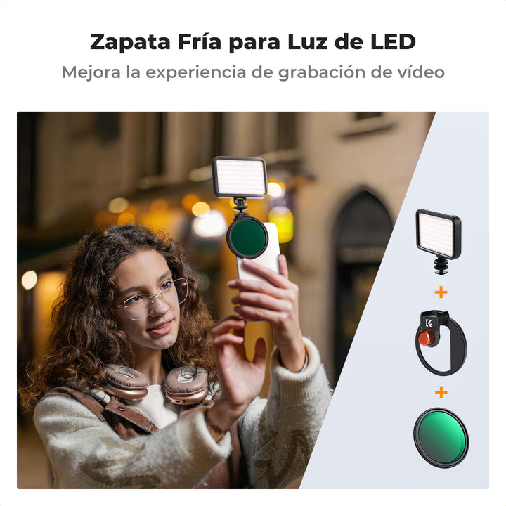En la parte superior del clip encontrarás una montura cold shoe que te permite conectar luces LED, micrófonos o transmisores inalámbricos, mejorando la iluminación y el audio en tus grabaciones. Este detalle convierte al adaptador en un mini rig profesional, ideal para videógrafos, creadores de contenido y vloggers que buscan un setup compacto pero funcional.