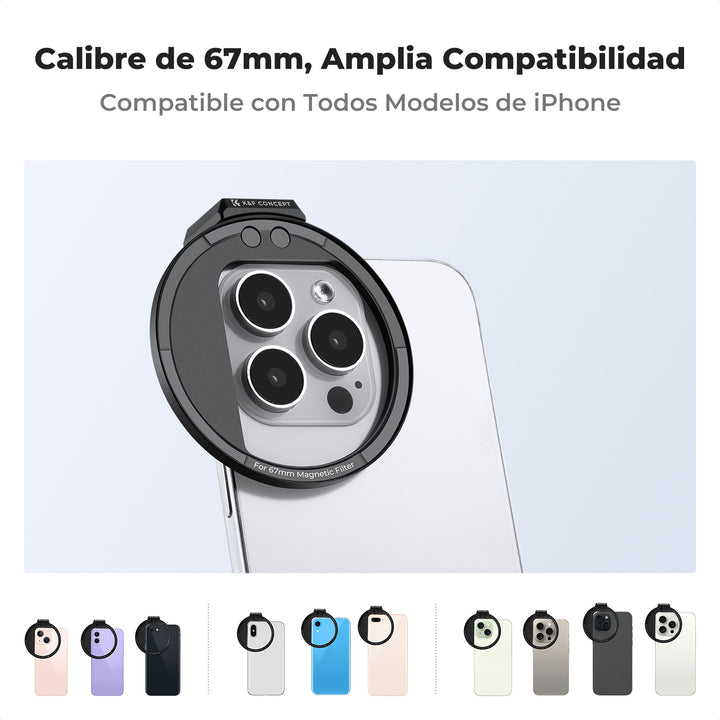 El clip de 67mm se adapta a la mayoría de los smartphones del mercado, incluyendo iPhone, Samsung, Xiaomi, Huawei y más, incluso con funda. Es compatible con todos los filtros magnéticos K&F Concept de 67mm, lo que te permite ampliar tus posibilidades creativas sin cambiar de adaptador.