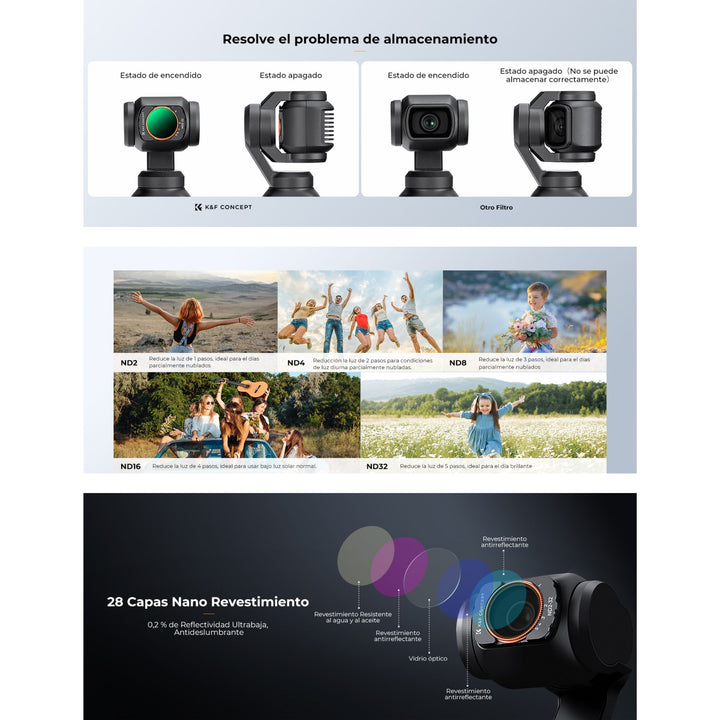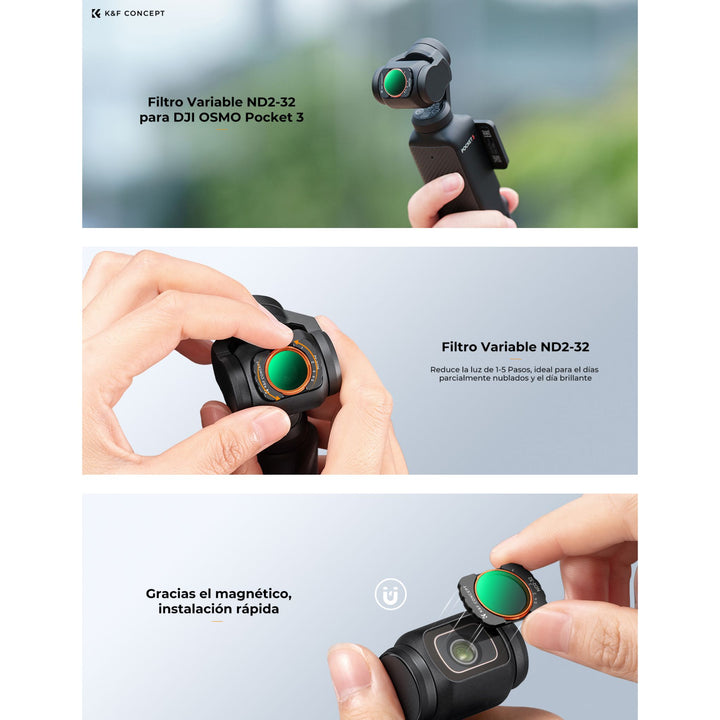 El filtro VND ND2–32 de K&F Concept está diseñado específicamente para el DJI Osmo Pocket 3. Su rango variable de 1 a 5 pasos permite ajustar la exposición sin modificar la velocidad de obturación, ideal para cine, viajes, vlogs y grabación profesional.