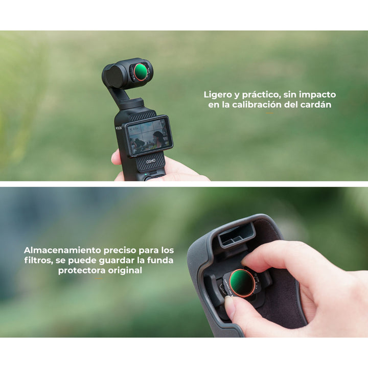 El cuerpo de aluminio aeronáutico mantiene el filtro ligero, resistente y estable. Su diseño ultrafino evita viñeteo y mantiene la calidad completa del sensor del Pocket 3.