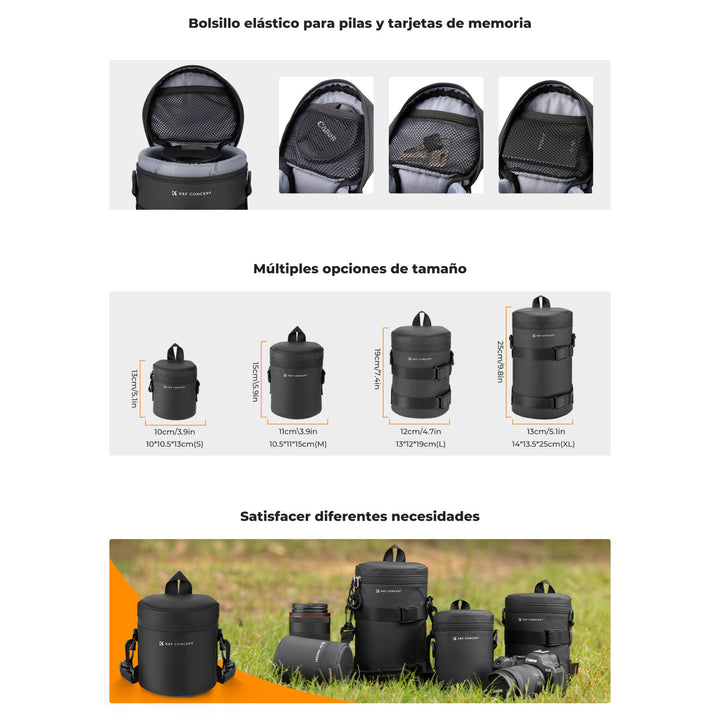La funda para lentes K&F Concept está diseñada para mantener tu equipo seguro sin importar el entorno. Su exterior resistente al agua y al desgaste ayuda a proteger tus lentes frente a lluvia ligera, polvo y salpicaduras, mientras que el interior acolchado mantiene cada elemento firmemente en su lugar.