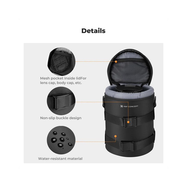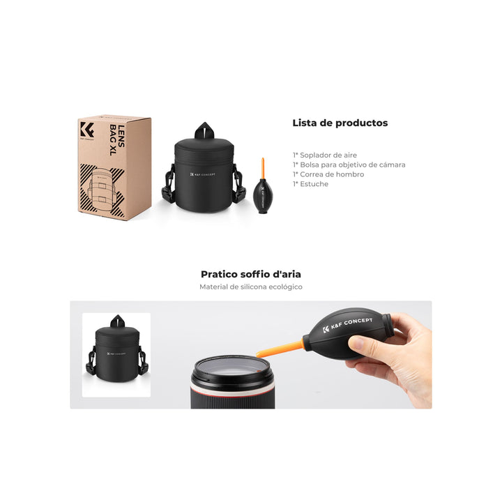 La Bolsa Protectora K&F Concept XL está diseñada para resguardar tus lentes en cualquier entorno. Con un tamaño interior de 11×22 cm, es ideal para objetivos telefoto y lentes profesionales de mayor longitud.