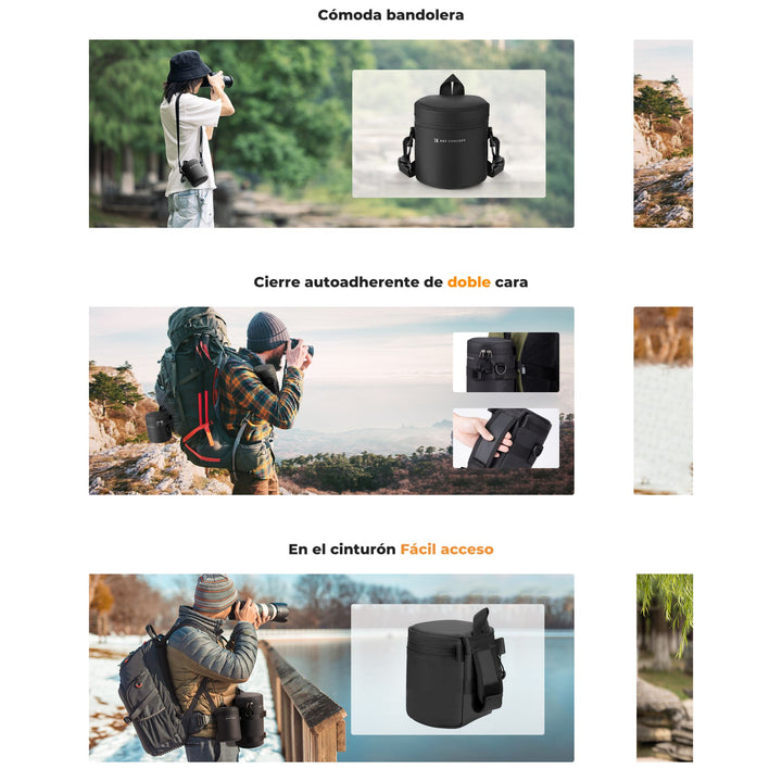 Su apertura superior con cremallera permite acceder rápidamente al lente. Además, su estructura se adapta a diferentes modelos de lentes DSLR y mirrorless.