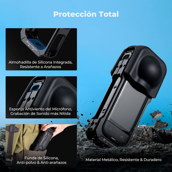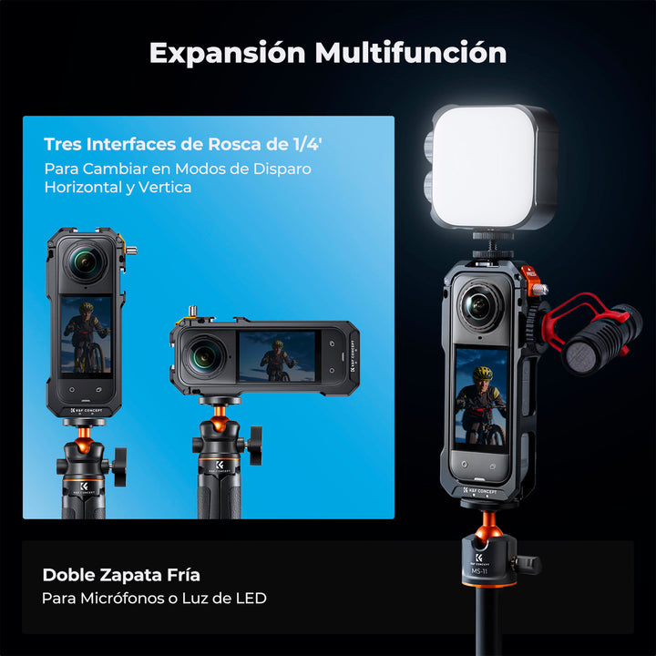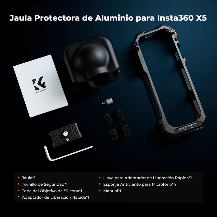 La Jaula de Aluminio K&F Concept para Insta360 X5 está diseñada para ofrecer seguridad, estabilidad y versatilidad en cada grabación. Fabricada en aleación de aluminio de alta resistencia, protege tu cámara de caídas, rayones y golpes sin afectar la conectividad ni el acceso a botones o batería.