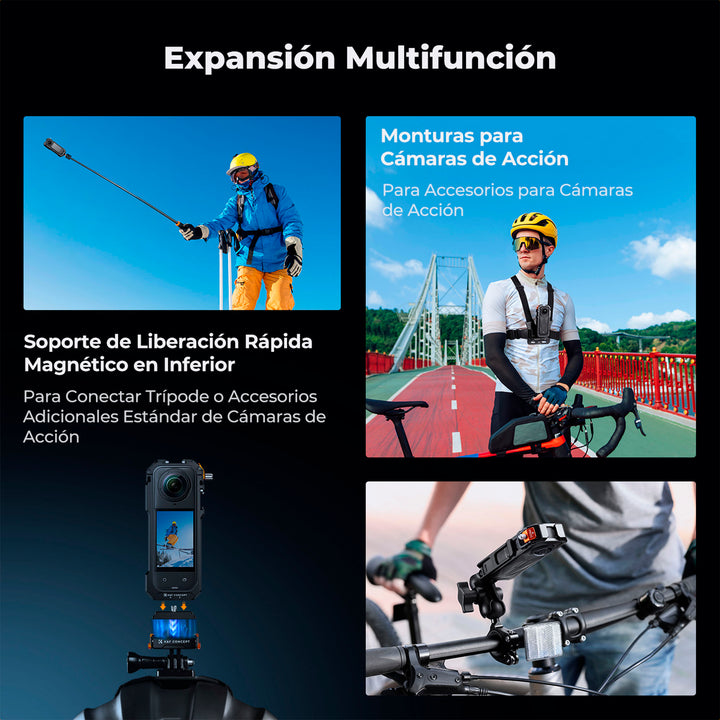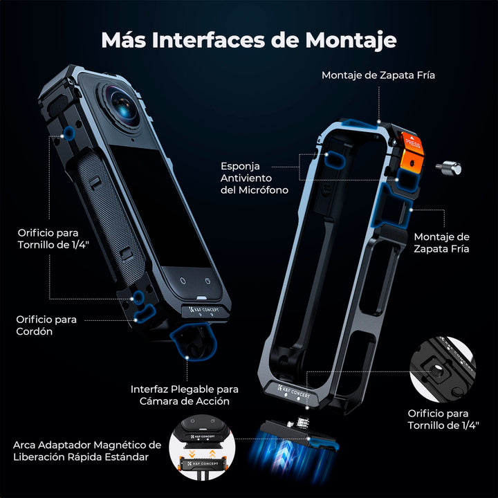 La jaula incluye múltiples interfaces de expansión que permiten montar accesorios adicionales como tripies, selfie sticks, micrófonos, luces LED o adaptadores cold shoe. Gracias a su compatibilidad universal, puedes construir tu set de grabación personalizado, ideal para creadores que buscan mayor flexibilidad en fotografía y video 360°. Su sistema de montaje rápido y sin herramientas te permite preparar la cámara en segundos. También puedes desmontarla fácilmente cuando no la uses, lo que mejora la eficiencia en sesiones con múltiples locaciones.