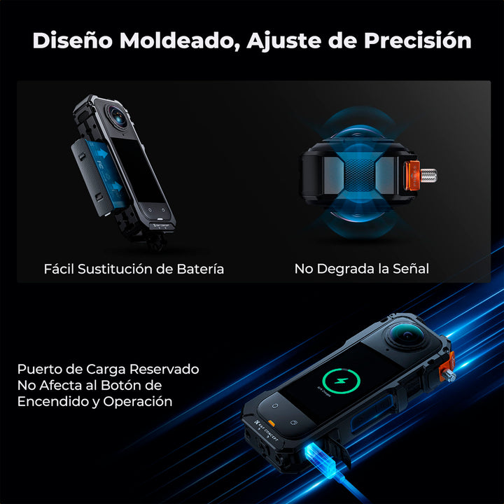 Su diseño preciso se adapta perfectamente al cuerpo de la Insta360 X5, asegurando un ajuste firme y profesional, incluso en entornos exigentes o tomas en movimiento.