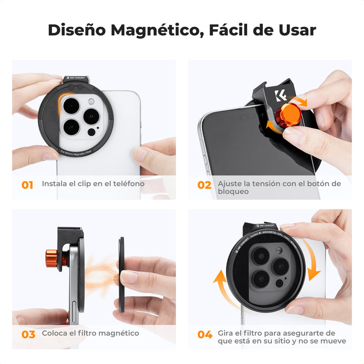 El sistema magnético inteligente permite colocar o cambiar filtros de forma rápida y segura. Solo necesitas acoplar el filtro al clip, ajustarlo sobre la cámara del celular y listo: en segundos estarás listo para grabar o fotografiar.
