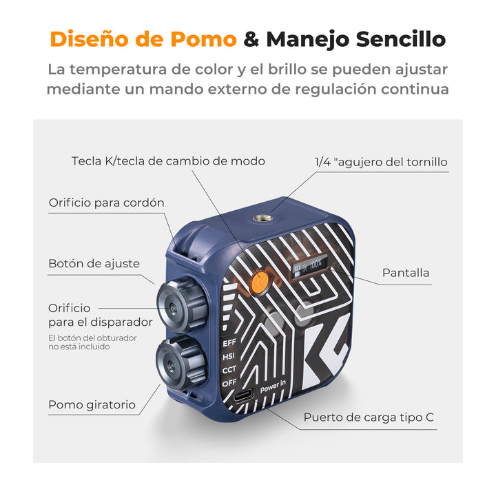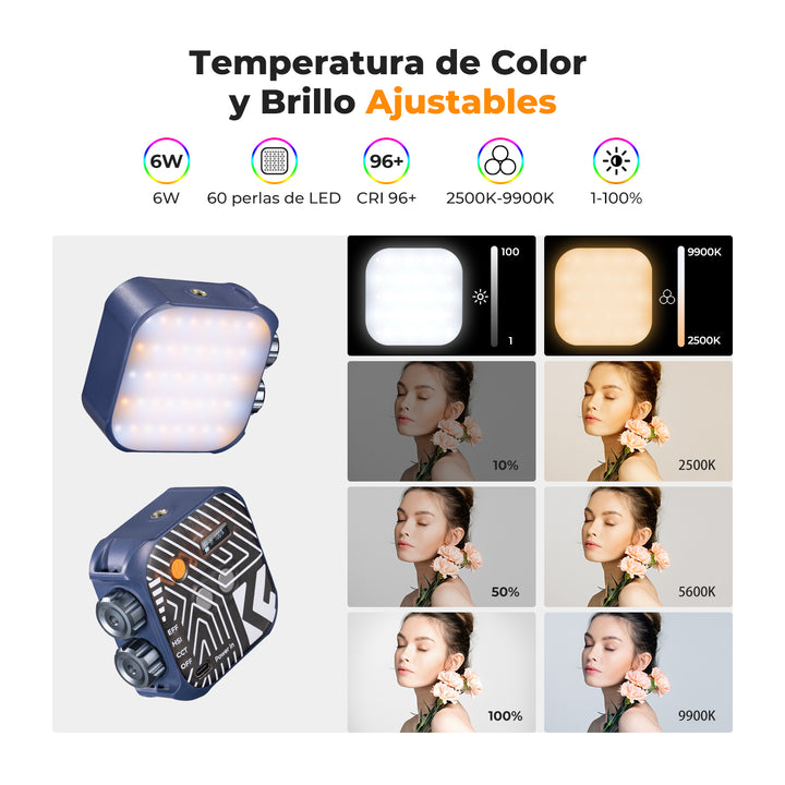 Gracias a su rango de temperatura de color de 2500K a 9900K, puedes pasar de tonos cálidos a fríos con un control total. Incluye un modo rápido a 5600K, que te permite ajustar al instante la luz natural de día sin perder tiempo configurando valores manuales. Su perilla metálica de ajuste infinito te da un control fluido, preciso y ergonómico para lograr la iluminación perfecta en segundos.