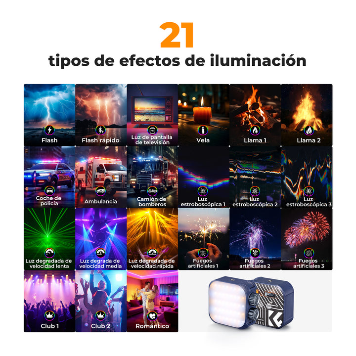 Dale dinamismo y atmósfera a tus producciones con 15 modos de efectos integrados, como relámpagos, luces de emergencia, fuego o parpadeo. Estos efectos son ideales para videos creativos, contenido cinematográfico o redes sociales, permitiéndote experimentar con distintas sensaciones visuales sin necesidad de accesorios adicionales.