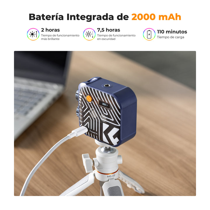 La L01 incorpora una batería de 2000mAh, recargable mediante puerto USB-C, que ofrece hasta 2 horas de uso continuo a máxima potencia o hasta 7.5 horas con brillo mínimo. Puedes utilizarla mientras se carga, ideal para sesiones prolongadas o grabaciones en exteriores. Con solo 2 horas de carga completa, estarás listo para grabar, fotografiar o crear sin interrupciones.