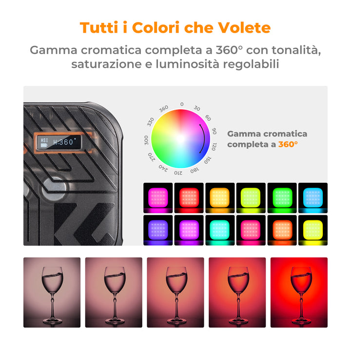 Su pantalla LCD integrada muestra todos los parámetros en tiempo real: brillo, temperatura de color y nivel de batería, facilitando los ajustes incluso en entornos oscuros. El chasis de aluminio con acabado mate ofrece durabilidad y una apariencia profesional. Además, cuenta con imanes traseros que permiten adherirla fácilmente a superficies metálicas, y una ranura para cuerda que facilita su transporte o almacenamiento.