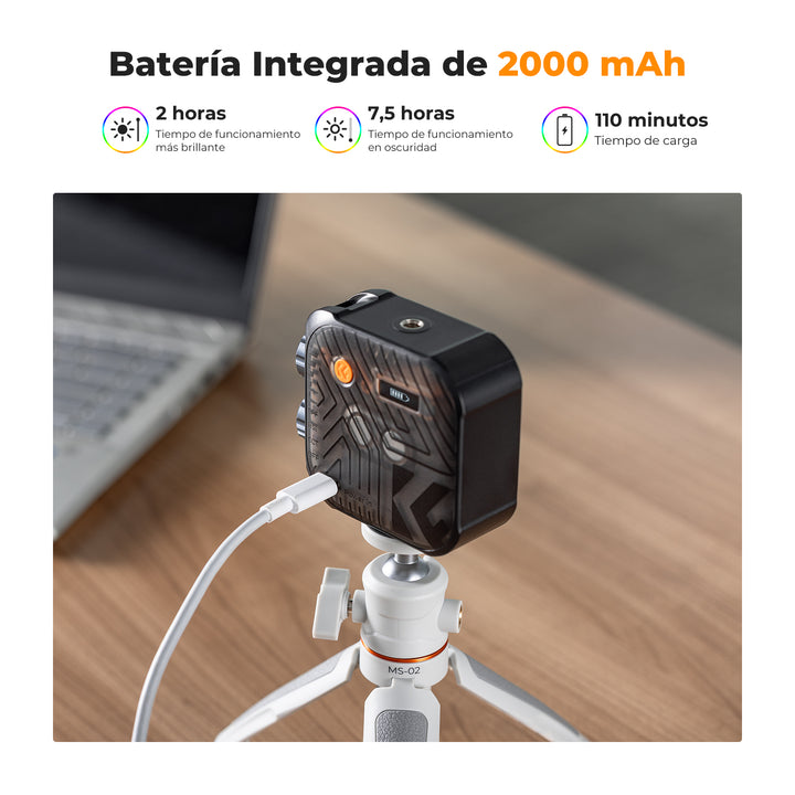 La L01 incorpora una batería de 2000mAh, recargable mediante puerto USB-C, que ofrece hasta 2 horas de uso continuo a máxima potencia o hasta 7.5 horas con brillo mínimo. Puedes utilizarla mientras se carga, ideal para sesiones prolongadas o grabaciones en exteriores. Con solo 2 horas de carga completa, estarás listo para grabar, fotografiar o crear sin interrupciones.