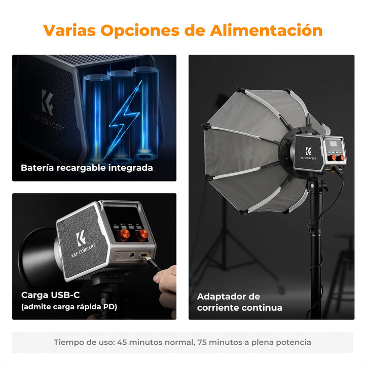 La PL60B cuenta con una batería interna de 4500mAh que ofrece hasta 75 minutos de autonomía en modo normal y 45 minutos en modo MAX. Gracias a su puerto de carga rápida Type-C PD3.0, puedes usar la lámpara mientras se carga, o alimentarla con power banks de más de 60W, eliminando la necesidad de cables o fuentes externas en tus sesiones.