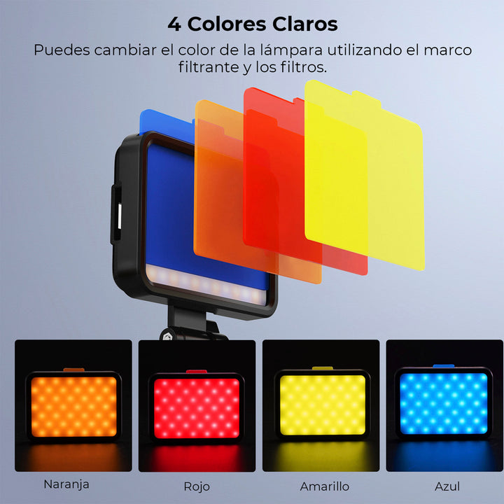 Equipada con 84 perlas LED de alta calidad (42 cálidas y 42 frías), esta lámpara ofrece una iluminación suave, uniforme y sin deslumbramientos, ideal para retratos, productos o contenido digital. Con un CRI ≥95, reproduce los colores con precisión y realismo, aportando una apariencia natural a tus fotos y videos. Además, incluye 4 filtros de color intercambiables, perfectos para crear efectos creativos y dar diferentes estilos o atmósferas a tus tomas.