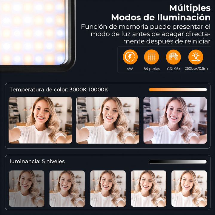 Ligera y fácil de usar, es perfecta para quienes buscan una luz versátil para grabar vlogs, hacer streaming, retratos o fotografía de producto.