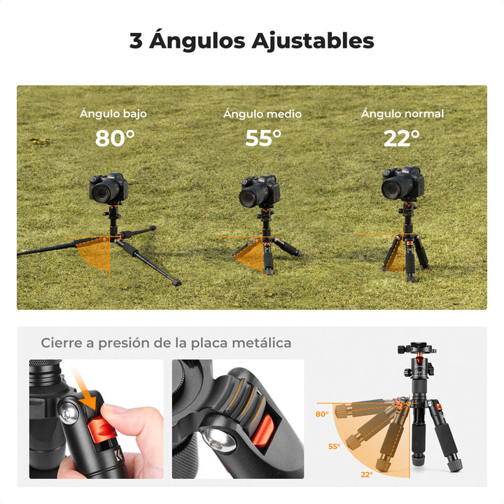 Fabricado con aluminio de alta resistencia, este mini tripie ofrece estabilidad sólida y durabilidad ante el uso constante. Su diseño plegable y sistema de bloqueo firme aseguran seguridad incluso con equipos pesados, manteniendo la estética moderna y profesional que caracteriza a K&F Concept.