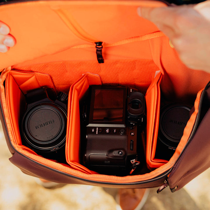Su capacidad de 20 litros expandible se adapta a tus necesidades gracias a un sistema de cierre magnético que ajusta la altura entre 18.3 y 22.3 pulgadas. En su interior, los divisores FlexFold ajustables permiten organizar cámaras, lentes, drones, micrófonos o accesorios sin que se muevan ni se golpeen.