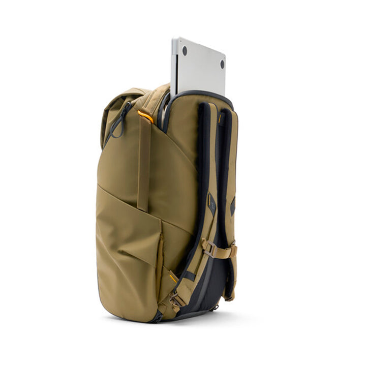 Pensada para acompañarte durante todo el día, su sistema de correas acolchadas pivotantes distribuye el peso de forma equilibrada. Incluye un arnés de pecho desmontable, asas laterales y superiores para diferentes formas de transporte, y un trolley sleeve para deslizarla sobre el asa de tu maleta en viajes.