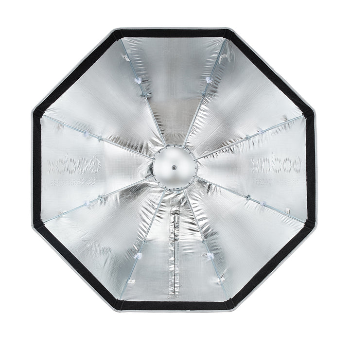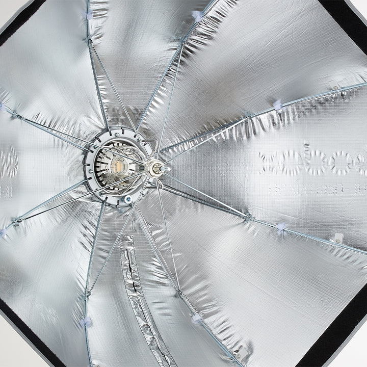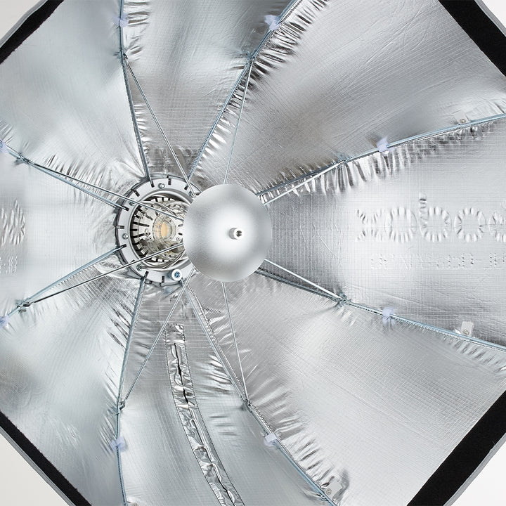 El interior plateado reflectante potencia la salida de luz y distribuye el haz de manera uniforme, haciendo de este modificador una gran opción para retratos, fotografía de moda, producto o grabaciones tipo entrevista.
