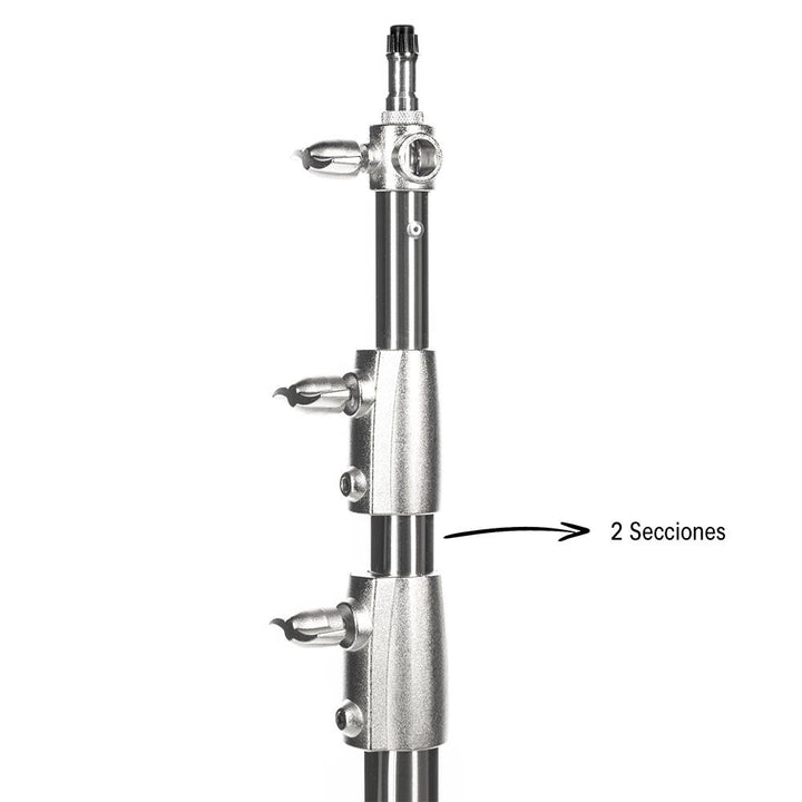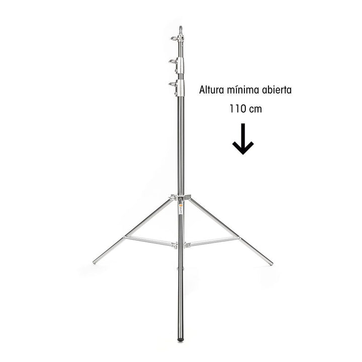 Con una altura máxima de 2.80 metros y una altura mínima abierta de 110 cm, ofrece versatilidad para montar diferentes setups tanto en estudio como en locaciones exteriores. Su diseño plegable de 96 cm facilita el transporte y la movilidad del equipo, haciéndolo ideal para fotógrafos, videógrafos y creadores que buscan rendimiento y durabilidad.